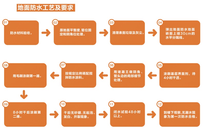 2、施工程序:清理基面→湿润基面→涂刷第一道聚合物水泥(基)防水涂料→涂刷第二道聚合物水泥(基)防水涂料→涂刷第三道聚合物水泥(基)防水涂料→闭水试验→质量验收→保护层及饰面施工